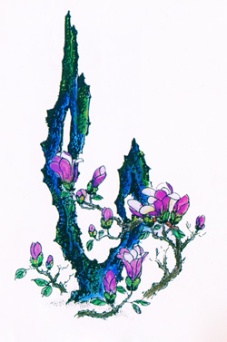 題注:辛夷俗稱木筆,圖案取其必字,湖石寓意長壽。必得其壽為祝壽之詞。